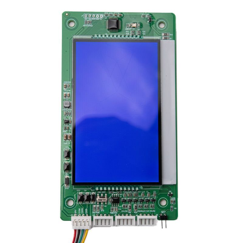 Display LCD ultradelgado de 4,3 pulgadas con pantalla azul, diseñado para visualización gráfica de información en sistemas de ascensores. Compatible con protocolo dedicado universal, ofrece una interfaz moderna, nítida y de alta resolución para mostrar piso, dirección y mensajes personalizados.